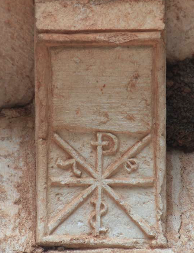 On remarque par exemple un chrisme que l’on a déjà vu sur l’église templière de Montsaunès, avec cependant une différence notable puisque si le P représente le Père, l'Alpha et l'Oméga le Fils et le S le Saint-Esprit, sur ce chrisme le S du Saint-Esprit est inversé et prend l'aspect du serpent sur l'Arbre de la Connaissance.3